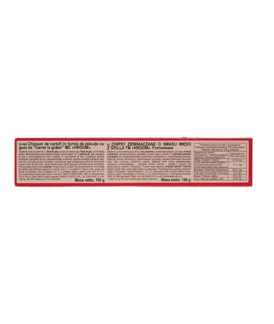 Tauche ein in den vollen, rauchigen Geschmack von Hroom! Chips mit Grillfleisch-Geschmack – knusprige Scheiben mit einer intensiven Note von gegrilltem Fleisch und feinen Gewürzen.
