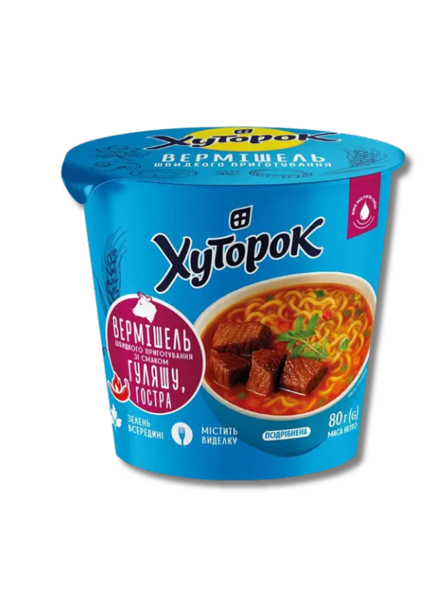 Die Vermicelli „Khutorok“ bietet ein leckeres Mittagessen in wenigen Minuten. Zart, aromatisch und sättigend, vermittelt sie den Geschmack von Zuhause jederzeit und überall. Einfach mit kochendem Wasser übergießen und den echten ukrainischen Geschmack genießen.