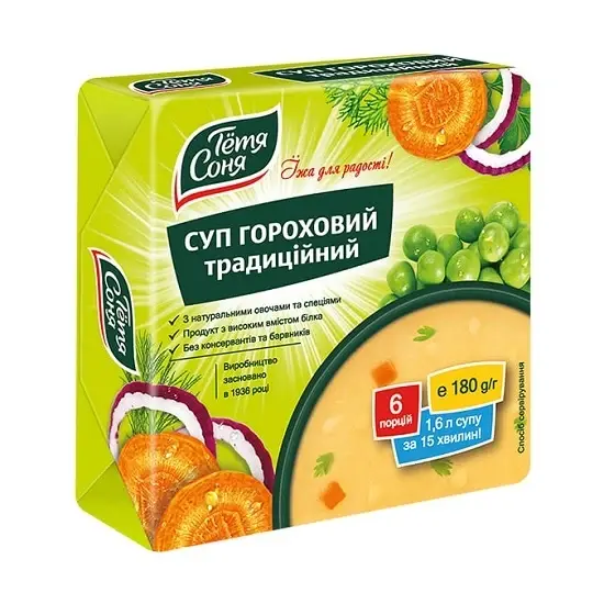 Gekochte getrocknete Erbsen (83,15%), Speisesalz, Weizenmehl, Pflanzenöl, getrocknetes Gemüse und Gewürze (Karotten, Zwiebeln, Petersilie, gemahlener schwarzer Pfeffer), Zucker, gebratene Zwiebeln, Natriumglutamat.